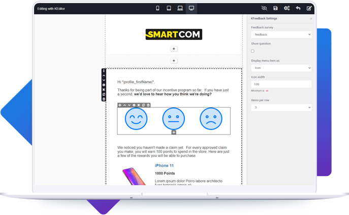 Easily set up feedback topics, for example, emoticon icons, then using Keditor drop your emoticon feedback into email templates that are either manually sent out to customers or triggered by an event managed using K-Journeys.