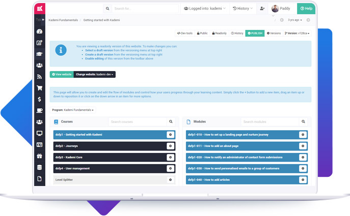 • Structure learning programs using Kademi’s drag and drop course builder.