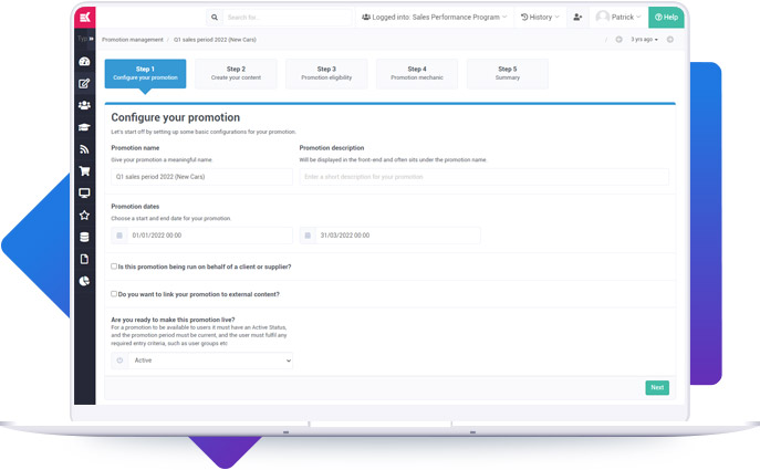 Configure promotion start and end dates, customer targeting, promotion content, and incentive and payout rules.